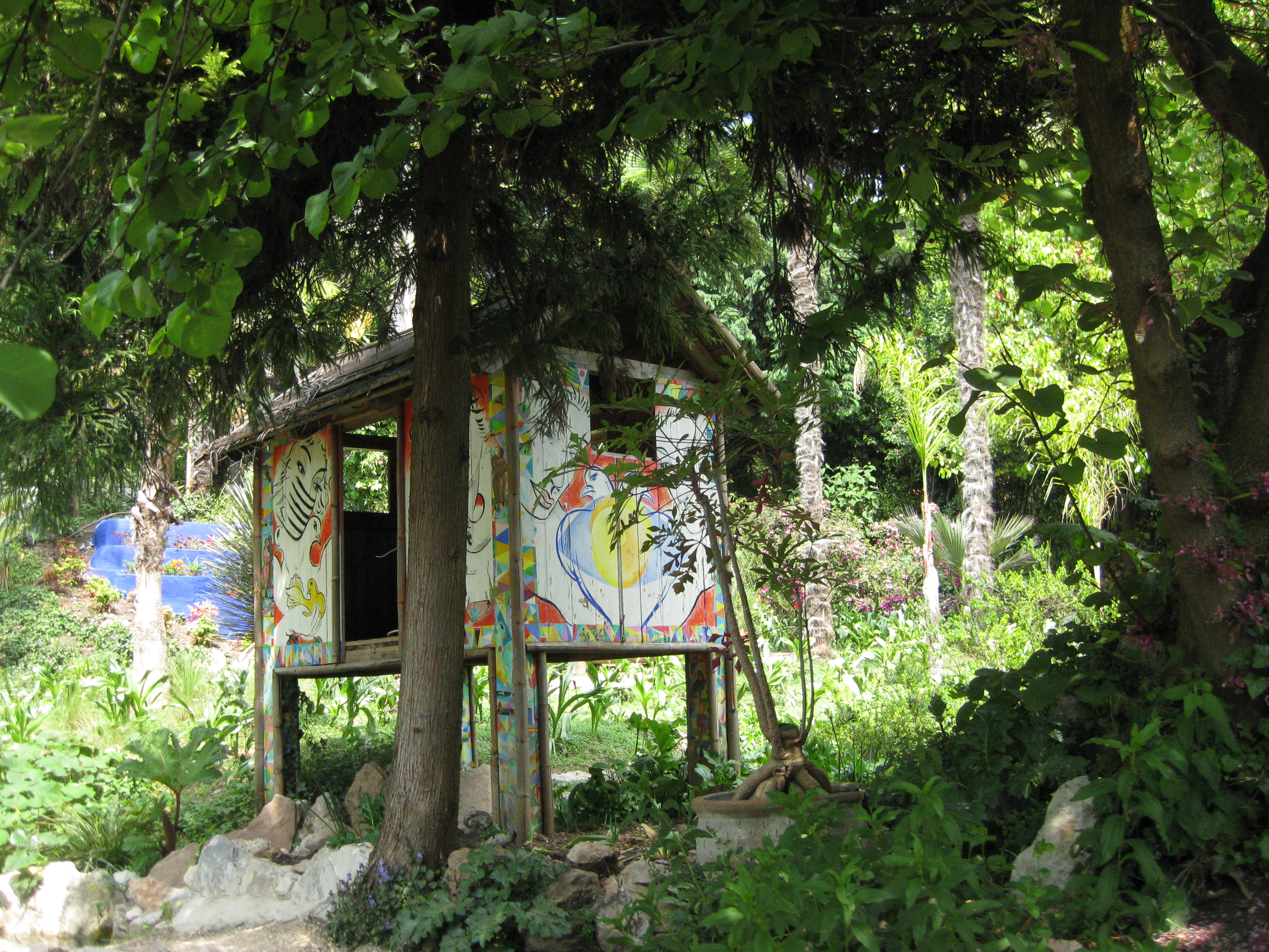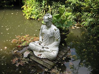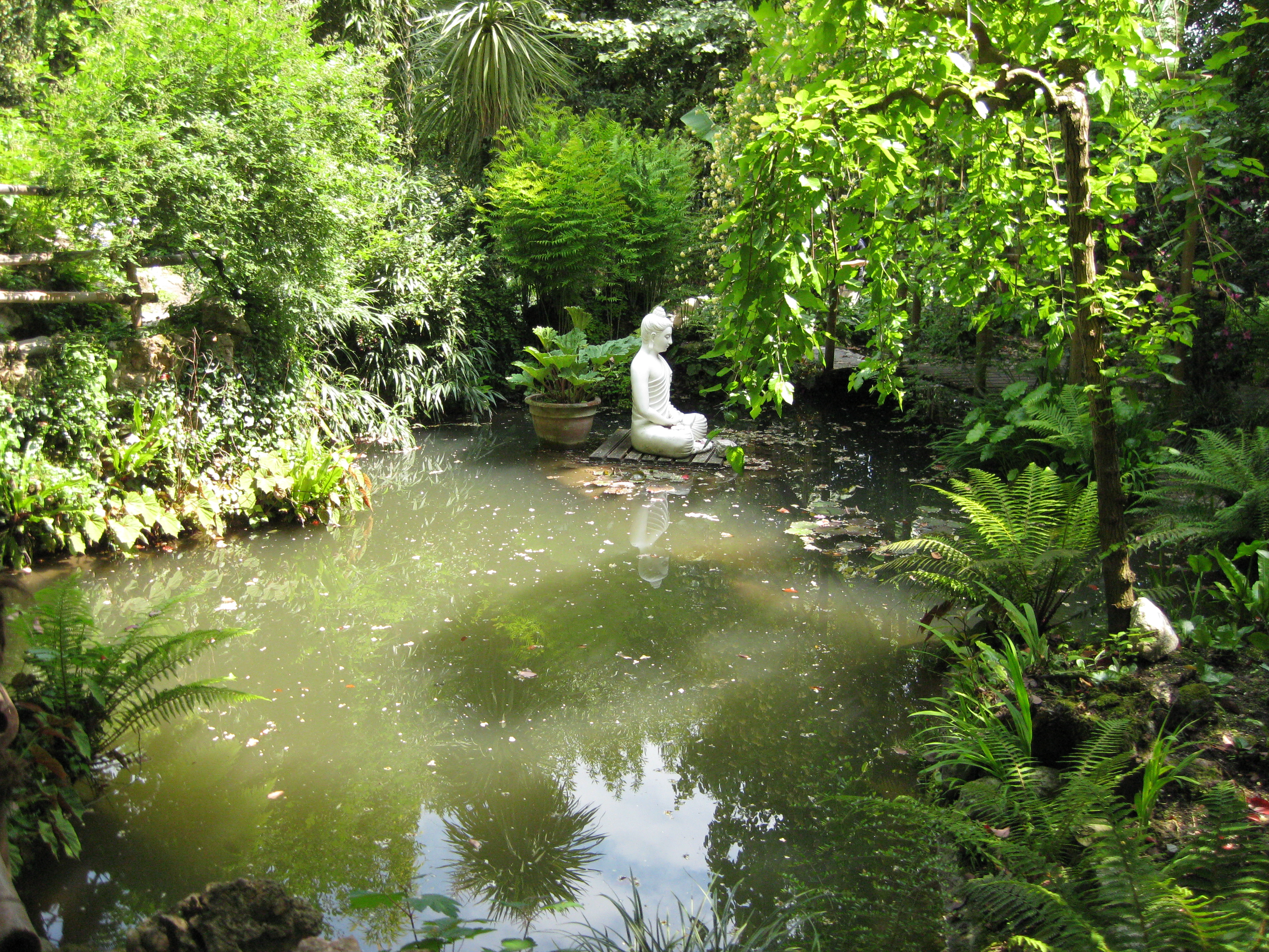 An heißen Tagen kann man an zahlreichen Teichen entspannen. Der Garten ist an einem Hang angelegt und Wasser sprudelt aus Brunnen und fließt überall in vielen kleinen Bächen.